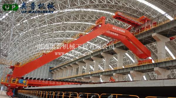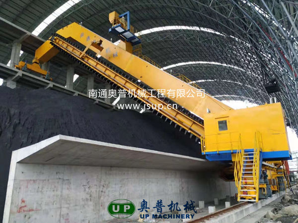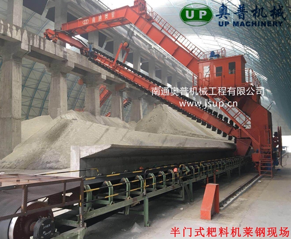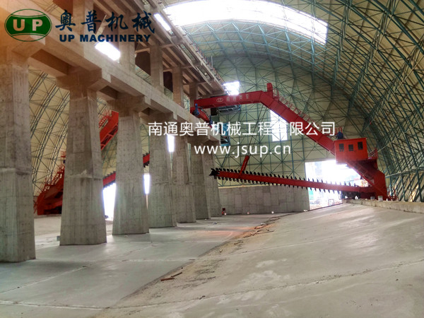 ▲南通奧普機械創(chuàng)新研制的“雙刮板、雙卷揚、翹尾式”半門式刮板取料機