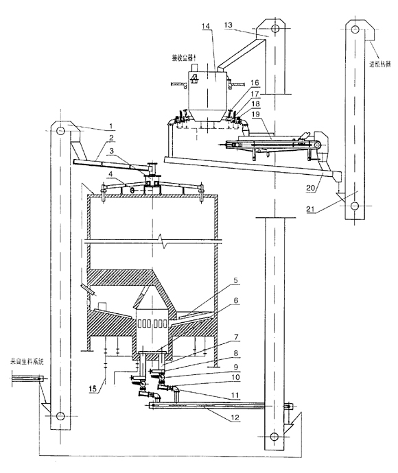 MF生料均化庫采用分配器和六根斜槽呈輻射狀卸入庫內(nèi),基本形成水平料層,庫底是錐形,略向中心頃斜,中部有一中心混合室,中心室與庫壁之間的庫底分為6-14個充氣區(qū),每區(qū)設(shè)3條充氣斜槽和1個卸料孔,卸料時向兩相對區(qū)輪流充氣,在卸料口上方出現(xiàn)多股漏斗凹陷,漏斗沿直徑排成一列,隨充氣的交換而旋轉(zhuǎn)角度,這樣不但產(chǎn)生重力混合,而且生料從庫底卸入中心室后,中心室底部連續(xù)充氣,使生料又獲一次均化,由于這種庫的均化原理是以料流漏斗重力混合為主要手段,所以電耗極省,能耗僅為0.432-0.576kwh/t,均化值可達(dá)7-10,該系統(tǒng)具有高效節(jié)能,基建投資低和操作管理簡便等優(yōu)點。